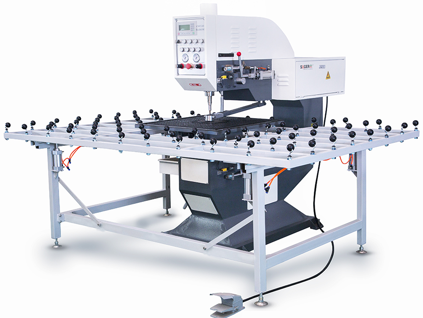 SZ-ZK080 Glass drilling machine is a glass processing machine which is easy to drill holes on sheets of glass and is equipped with upper and lower drilling bit. An automatic cylinder drives the lower-drill bit while the upper bit is operated by pneumatic or manual. Holes of different sizes can be achieved with bits of different diameters. This machine works efficiently; it has low glass damage and is easy to operate.